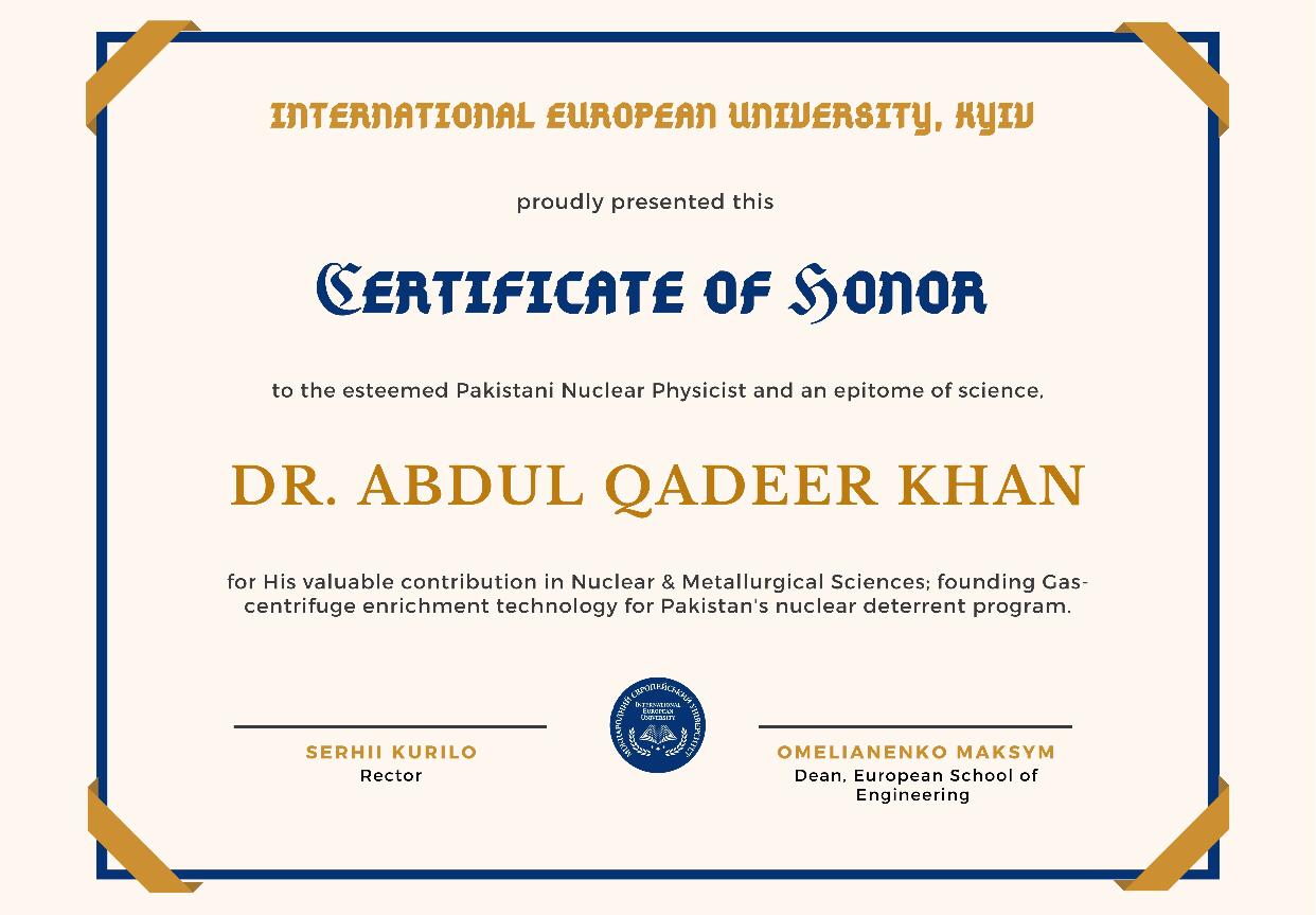 Від імені університету Сертифікат пошани підписано ректором МЄУ та директором ННІ "Архітектурно-інженерна школа". У відповідь пан Абдул Кадир Хан подарував книгу власного авторства з автографом.