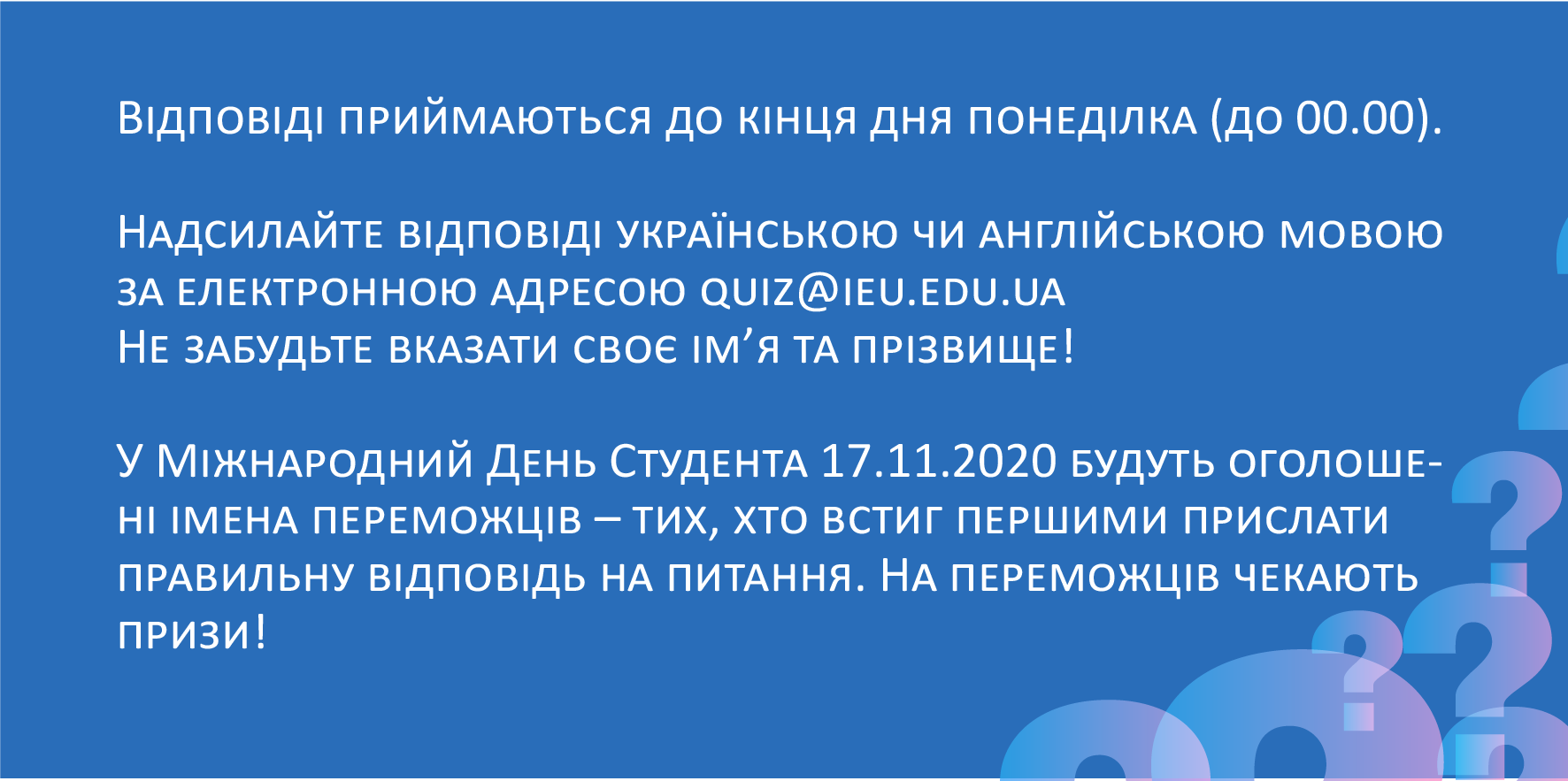Міжнародний європейський університет запрошує всіх бажаючих взяти участь у вікторині Головна / Про УНІВЕРСИТЕТ / Новини / Міжнародний європейський університет запрошує всіх бажаючих взяти участь у вікторині Контакти Адреса проспект Академіка Глушкова, буд.42 В, м. Київ, Україна - 03187 Телефон +38 063 169 98 67+38 096 303 77 70+38 063 303 77 70 Email Приєднатися до нас Контакти Ректорат +38 (044) 338 00 42 Приймальна комісія +38 096 303 77 70+38 063 303 77 70+38 063 169 98 67 Foreign students department +380507133624 Наша адреса проспект Академіка Глушкова, буд.42 В, м. Київ, Україна - 03187