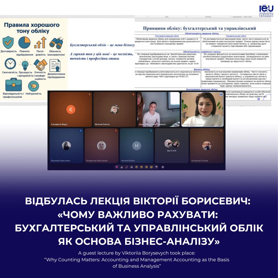 В МЄУ відбулася гостьова лекція Вікторії Борисевич, головного бухгалтера групи компаній ТОВ «Родинне Джерело» та медичного центру IVMED, на тему «Чому важливо рахувати: бухгалтерський та управлінський облік як основа бізнес-аналізу».