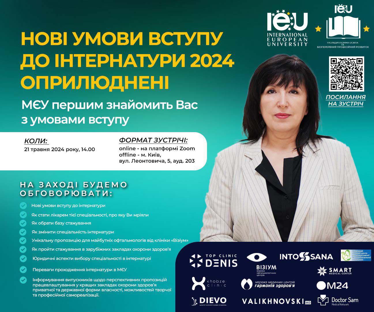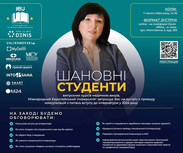 На заході будемо обговорювати нові умови вступу до інтернатури, як стати лікарем тієї спеціальності, про яку Ви мріяли, як обрати базу стажування, як змінити спеціальність інтернатури, як стати сучасним лікарем, на якого «полюють» роботодавці та багато іншого.